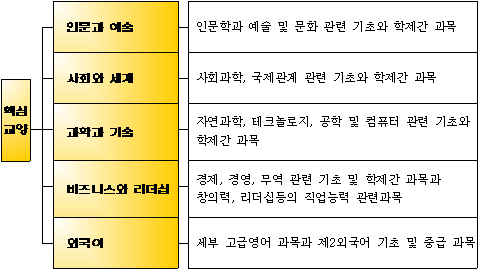 - 핵심영역교양과목은 5영역별로 20과목 정도를 학부/과와 단과대학에서 추천을 받아 대학본부에서 개설하고 운영한다.