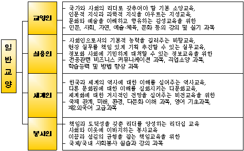 - 본교의 교육목표 가운데 4가지(교양인,실용인,세계인,봉사인)소양별영 역으로 교양과목을 편성 운영하며 학문간 융합화(Academic Convergence) 과 목을 구체화한다.