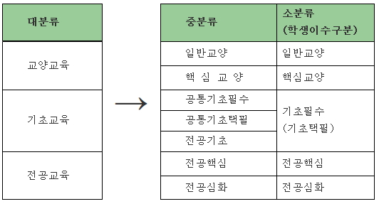 ● 전공기초 : 학과 자체적으로 전공기초성격인 교과목을 기초필수로 개설할 수 있음. 다만, 대학에 공통적으로 필요하거나 단과대학 특성을 나타낼 수 있는 전략적 교과목 1~2개를 단과대학 교육과정위원회에서 선정하여 대학내 모든 학과에 개설 요망