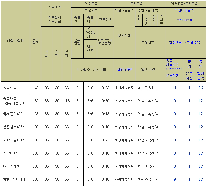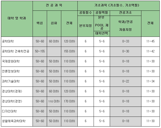 | 캠퍼스 | 대학 및 학과 | 공통기초필수 | 공통기초택필 | 전공기초 | 총 개설학점 |