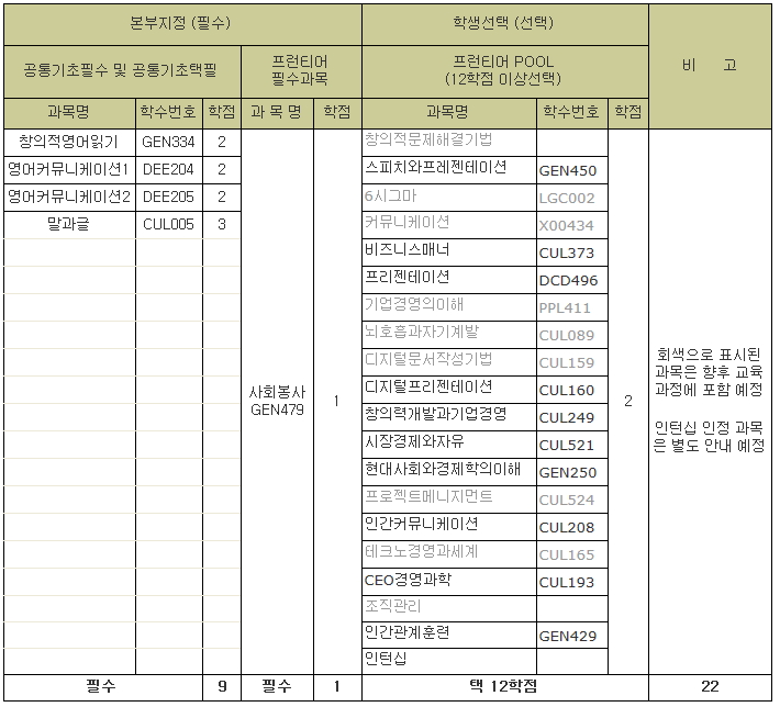 | 캠퍼스 | 대학 및 학과 | (프런티어 인증) (공통기초필수+교양) |