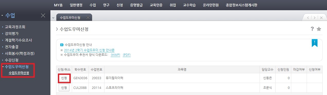 가. HY-in 로그인 → 수업 → 수업도우미 신청 → 대상과목조회후 신청
