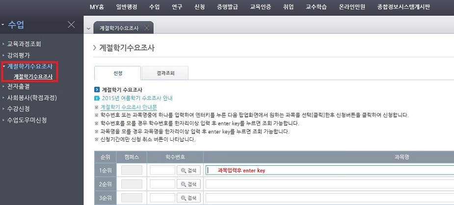 ▶ 계절학기 개설과목을 결정하기 위하여 학기중 실시