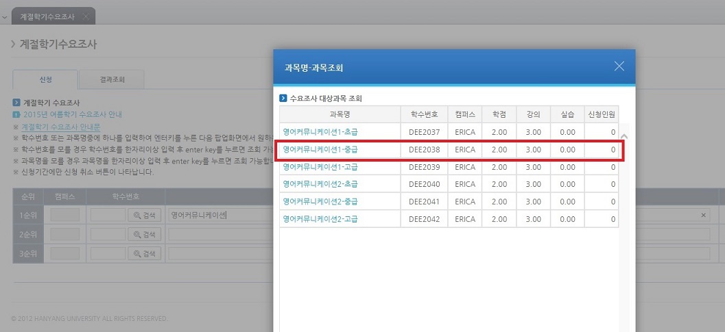 4) 수요조사결과조회 화면에서 현재 인원수에 본인이 신청한 과목까지 포함하여 카운트된 숫자확인 가능.