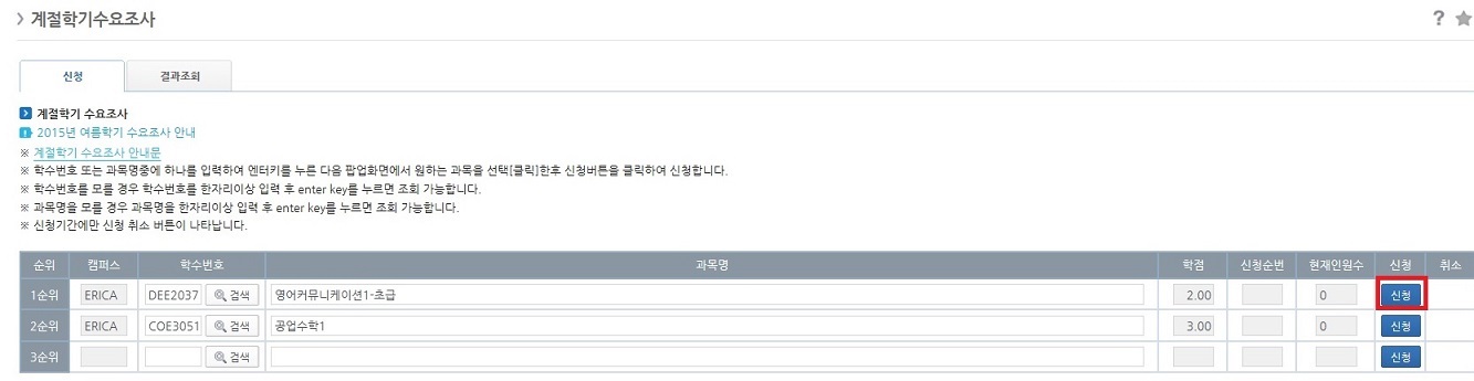 3) 원하는 과목 확인이 완룔되면 신청버튼 클릭 ( "신청"버튼은 계절학기 수요조사 기간에만 가능) - 취소도 가능