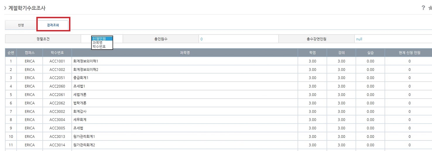 [신청인원 - 과목명 -학수번호순으로 조회가능]
