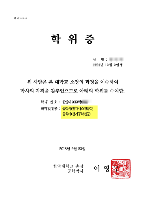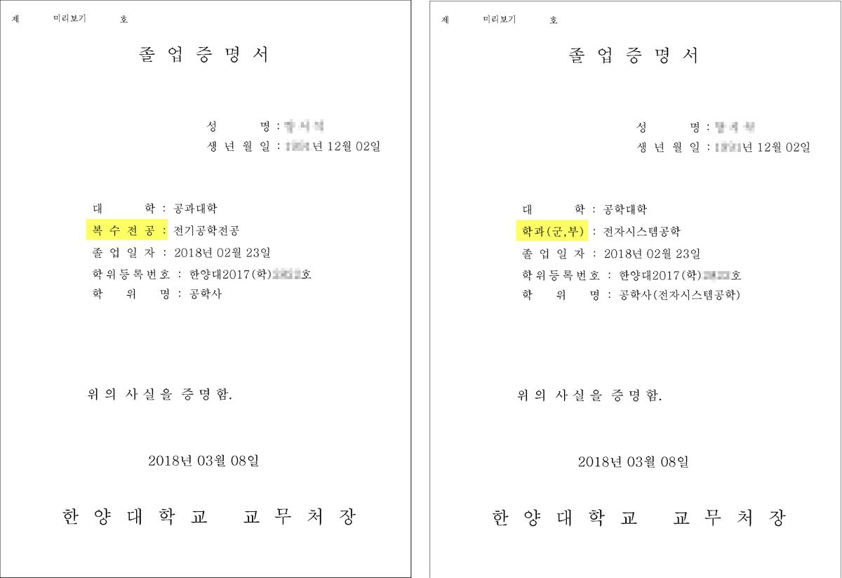- 학위증은 1장만 나가며, 주전공과 복수전공 학위명이 함께 기재가 됨