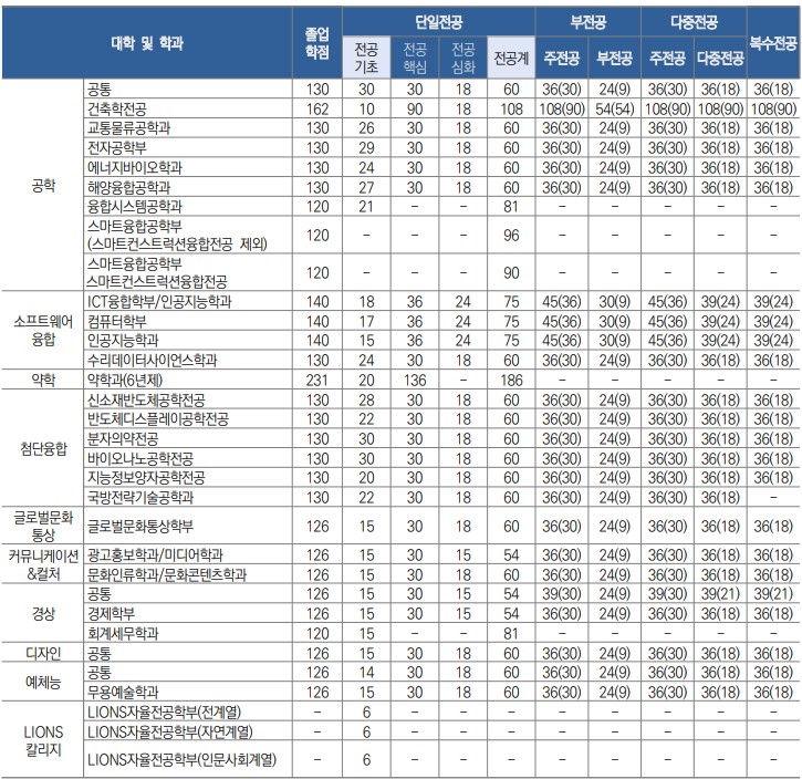 | 공학대학 | 공통 | 72(36) | 42(36) | 30(12) | 42(36) | 42(21) | 42(21) |