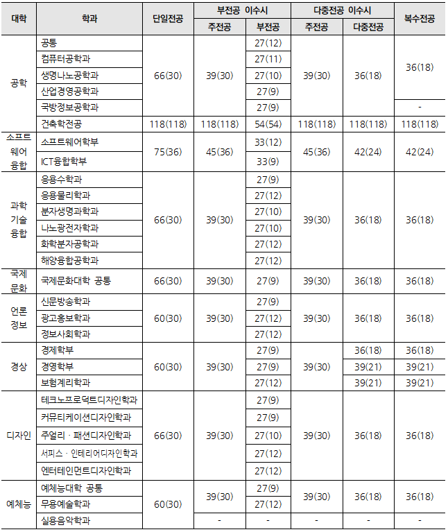 | 언론정보대학 | 66(36) | 42(36) | 30(9) | 42(36) | 42(21) | 42(36) |