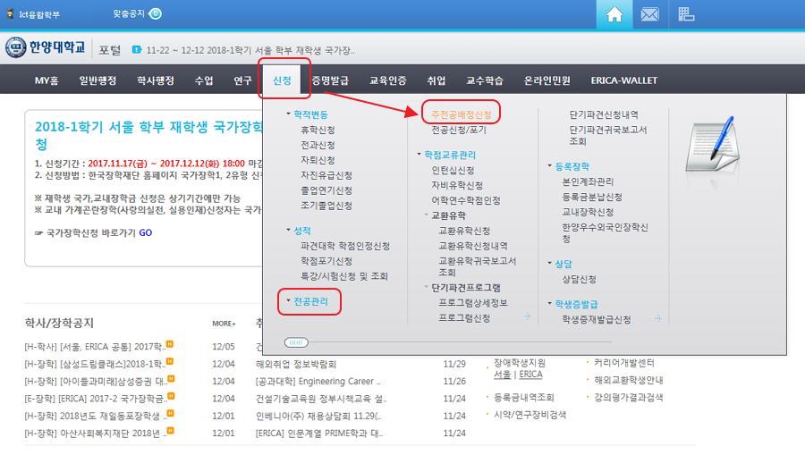 포털 내 학생 메뉴 위치 : 포탈 로그인 > 신청 > 전공관리 > 주전공배정신청 선택