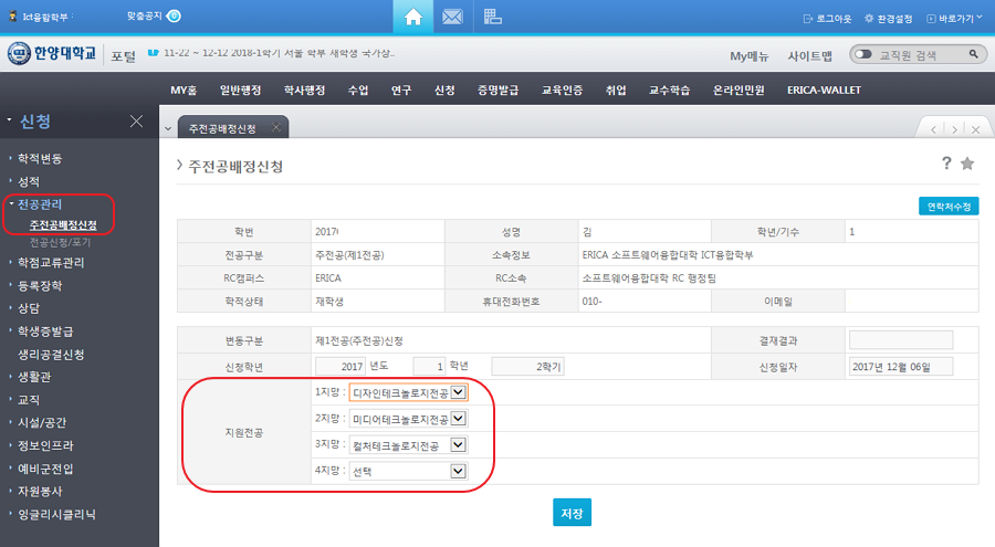 * 해당 신청화면에서 지원 전공을 선택 후 저장하면 완료. 이때 휴대전화번호와 이메일을 반드시 확인하여 합니다.