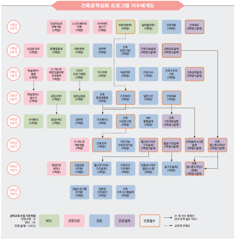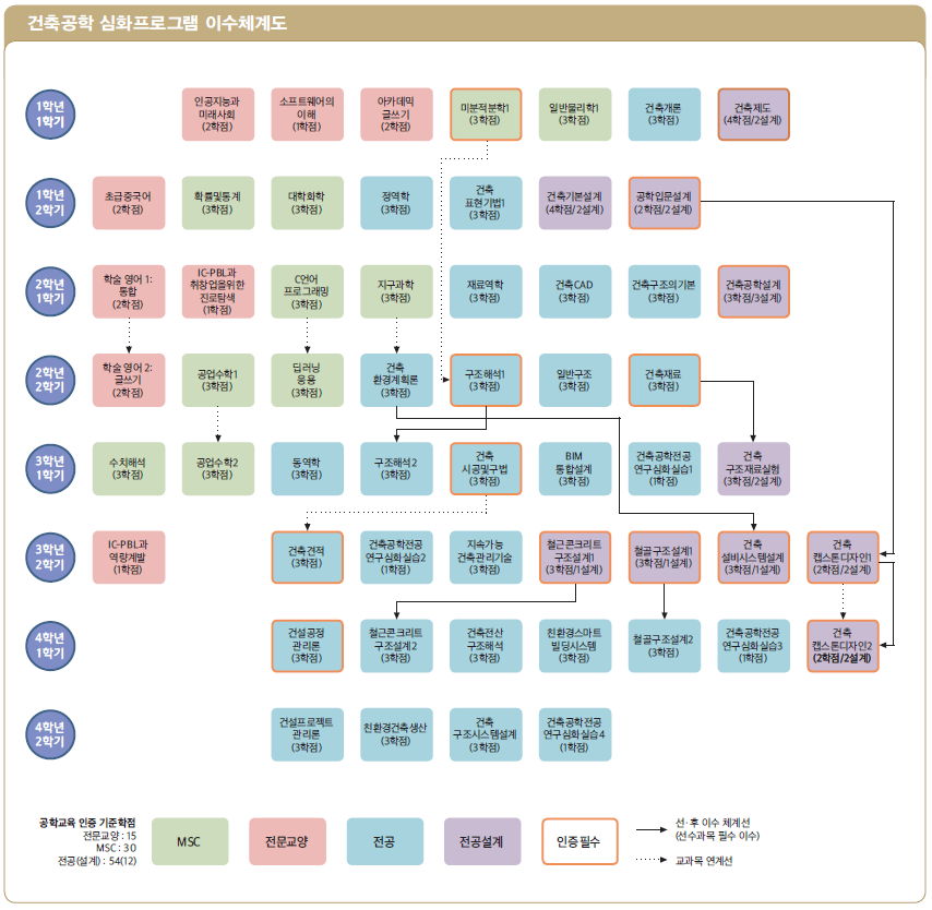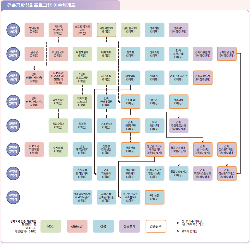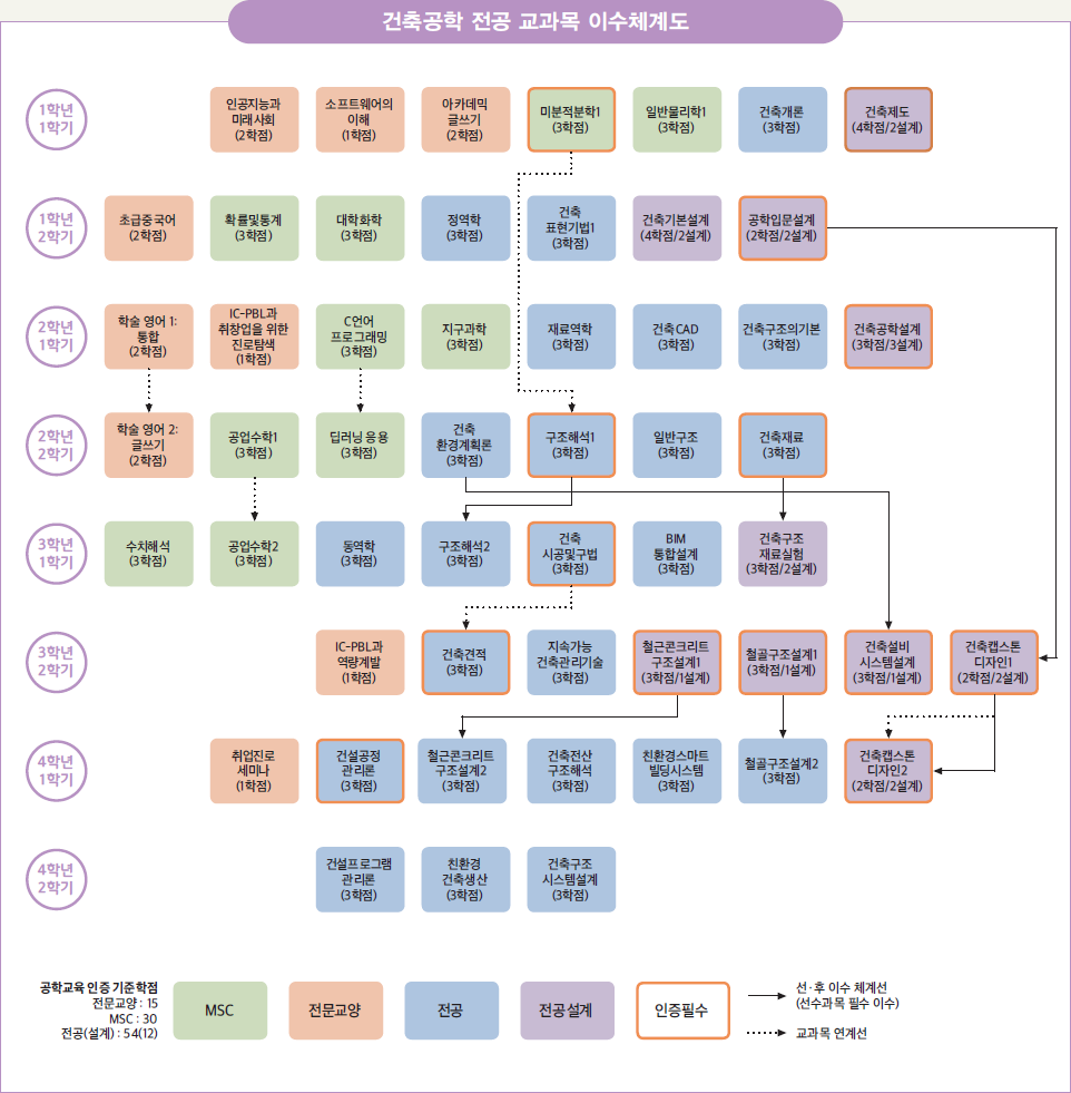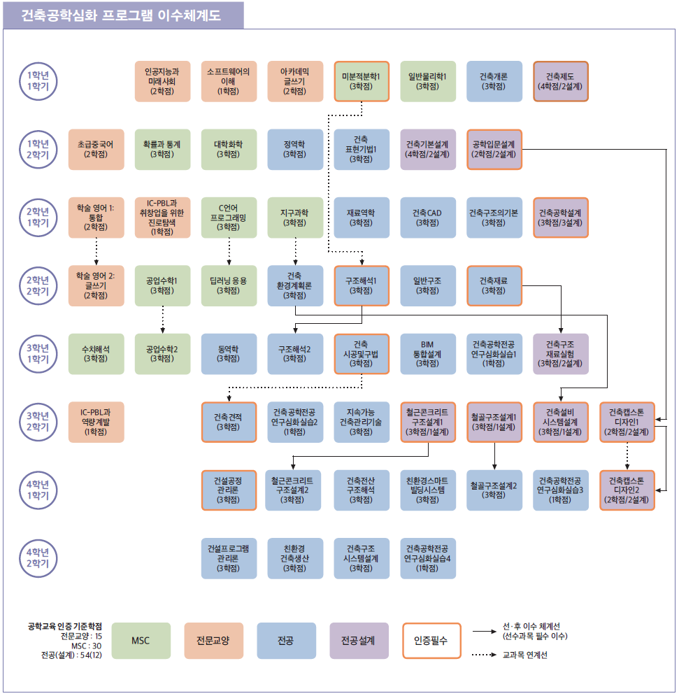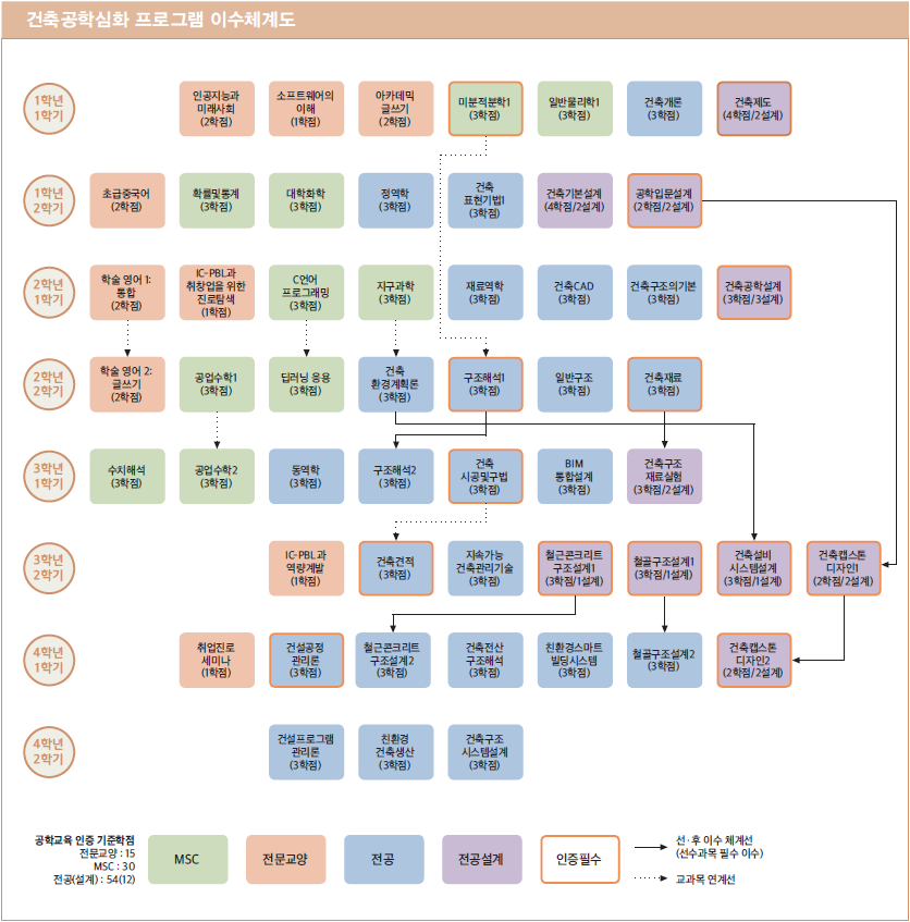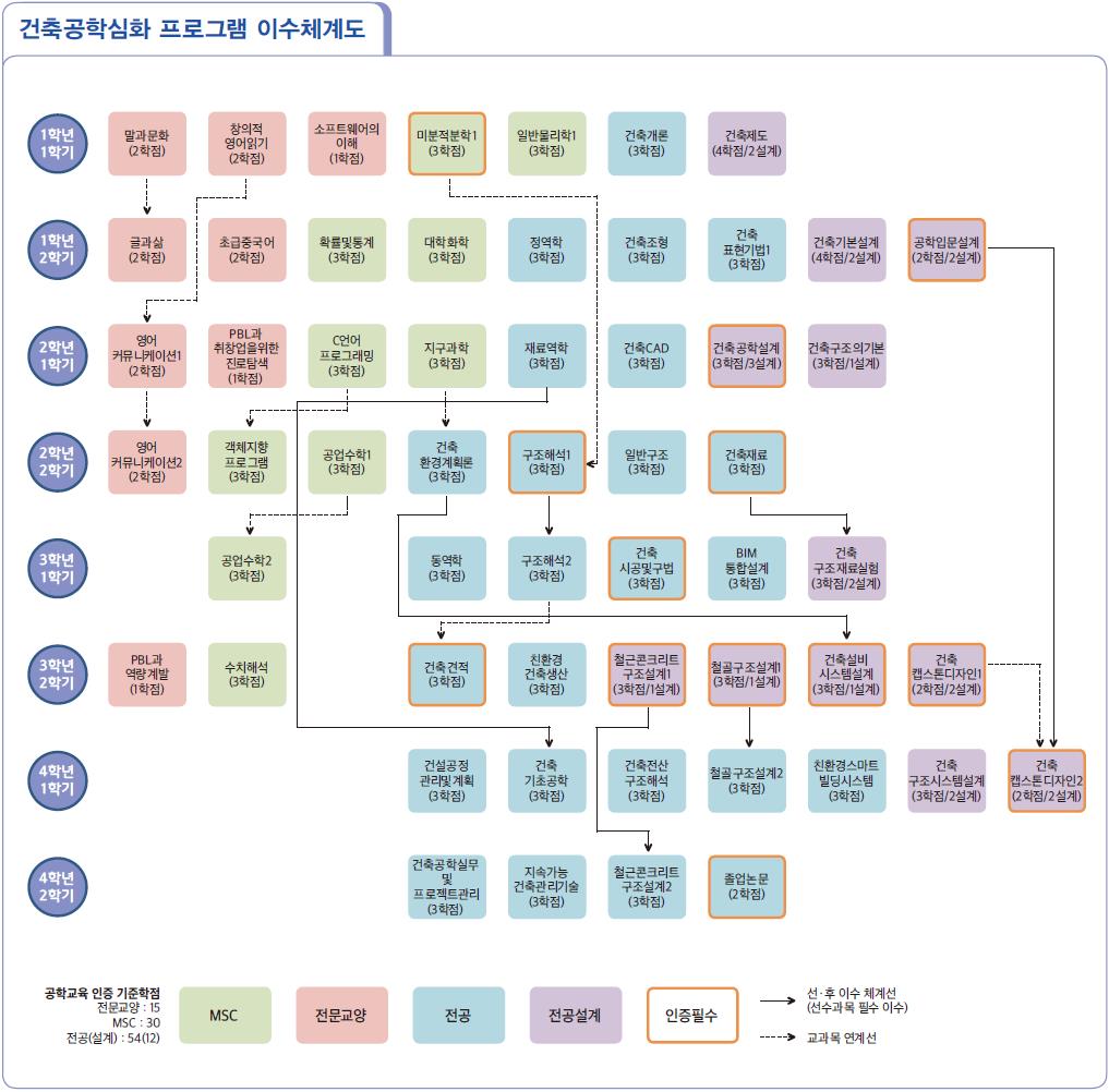 건축공학기초설계, 건축공학설계1, 구조역학, 건축공학설계2, 건축재료, 건축시공, 철근콘크리트구조설계, 강구조설계, 건축견적, 건축설비, 건축캡스톤디자인1, 건축캡스톤디자인2, 건설공정관리론, 건축캡스톤디자인3