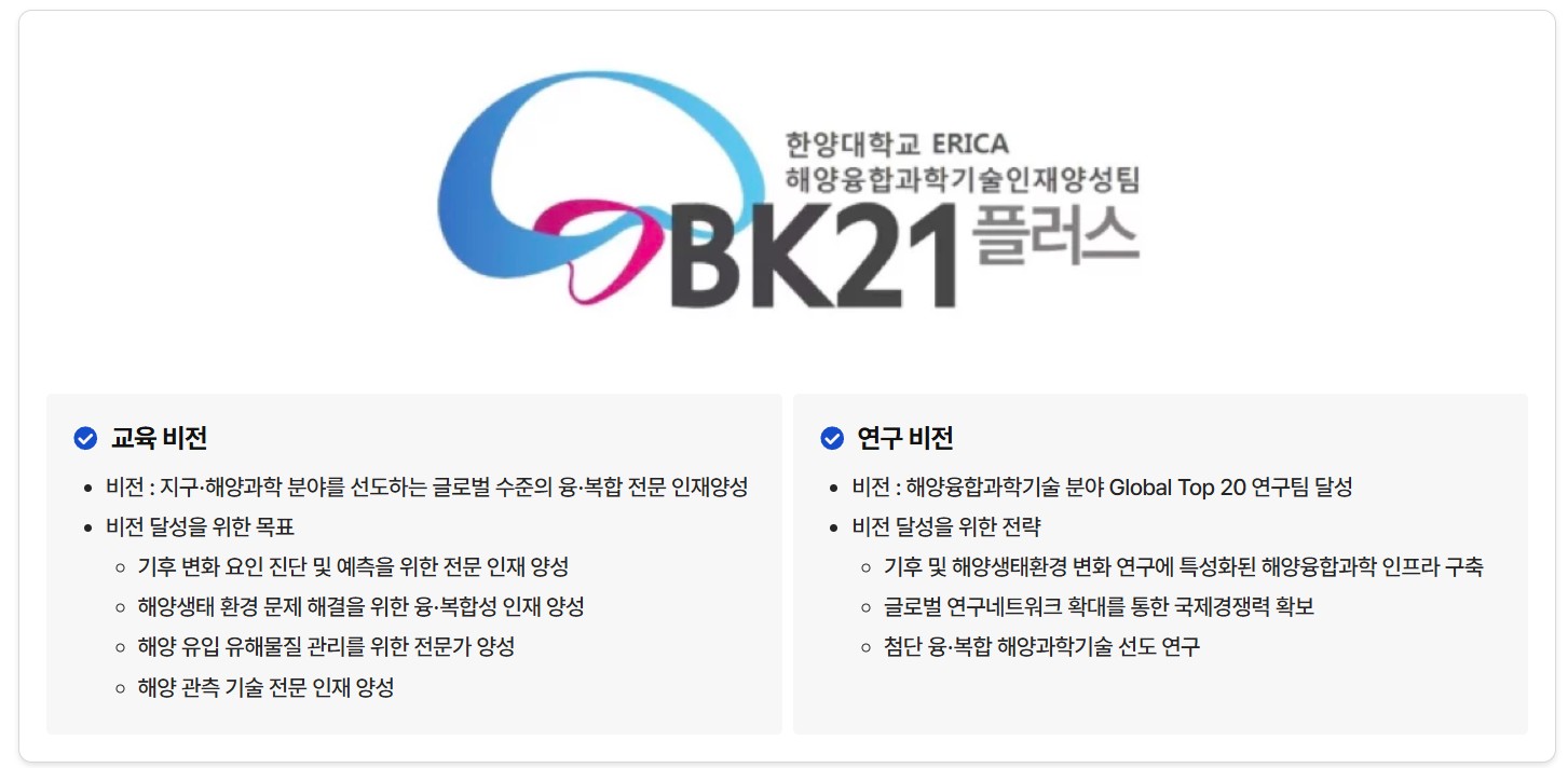 BK21은 세계적 수준의 대학원을 육성하고 우수한 연구 인력을 양성하기 위해 석사, 박사 과정생 및 신진 연구인력(박사후 연구원 및 계약교수)을 집중적으로 지원하는 고등교육 인력 양성 사업입니다. 해양융합공학과는 2013년부터 한국연구재단의 지원을 받아 BK21 사업을 단일 학과로 성공적으로 수주하여, 대학원의 연구 경쟁력을 입증해왔습니다. 이 사업을 통해 대학원생들의 연구와 교육에 지속적인 지원이 이루어지고 있으며, 2027년 8월까지 매년 7억 3천만 원의 지원금을 확보하였습니다.