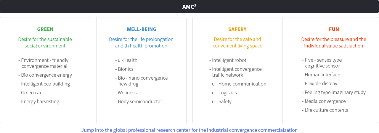 Advanced Manufacturing Convergence Center is organized by collaboration between Hanyang University and KITECH to establish “Practical Convergence for industries.” This center offers human and technical infrastructure to develp fabrication technology, Materials technology as well as its overall system. This center builds successful industrial Convergence example, and tries to promote original technology with human resource, to establish the goal of world frontier research center.