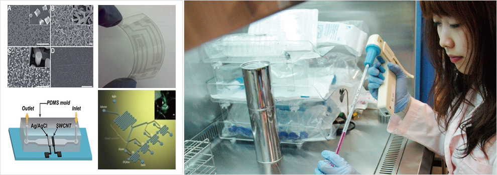 본 연구실에서는 차세대 나노재료로 주목을 받고 있는 카본나노튜브 (CNT)와 금속/반도체/고분자 나노입자를 활용한 새로운 형태의 고감도 나 노바이오센서/바이오칩 개발에 관한 연구를 수행하고 있으며, 개발된 나노 바이오센서/바이오칩은 의료진단이나 환경오염물질 검출과 같은 다양한 분야에 활용된다. 또한 카본나노튜브와 실버나노와이어와 같은 나노와이 어 기반의 플렉스블 전기화학 바이오칩에 대한 연구도 수행하고 있다.